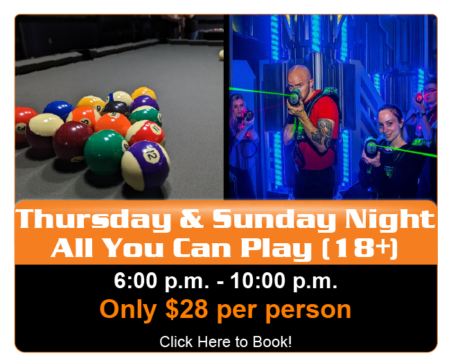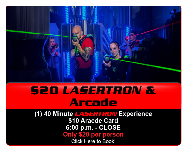 Specials Must be 18 or older Must be 18 or older Hours - Click Here Tag us on Instagram @iplaylasertron and receive a $10 arcade card